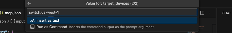 "inputs": [ { "type": "promptString", "id": "pe-pat", "description": "PE API Key", "password": true } ]Add a headers property to your MCP definition referencing your API key input. Your MCP server definition should look something like this: