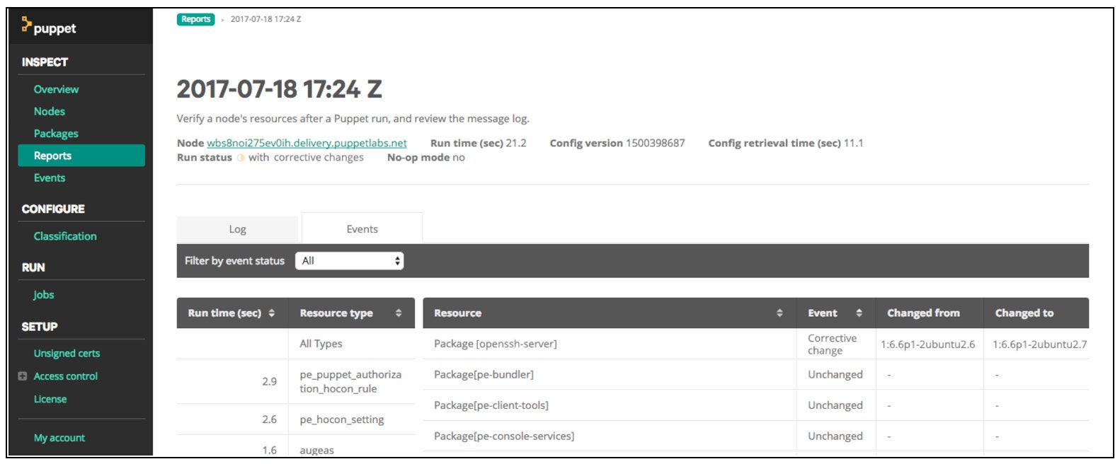 To track changes after Puppet makes them, use the Puppet Enterprise console. You can view all changes, both intentional and corrective, all the way from the most recent run for each node you manage (both in enforcement and simulation — or “no-op” — mode) to runs that occurred up to two weeks ago (or even longer, if you customize your report settings).