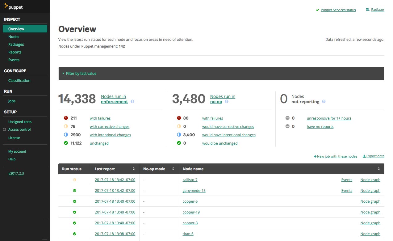 Puppet Enterprise console reporting tools — run reports, logs, catalog visualization and event inspection — help you to quickly zoom from a high-level view of overall infrastructure health down to a deep dive into a single event. You can discover what changes occurred in your approved configuration, when they occurred and whether they form a pattern of change that you need to investigate further.