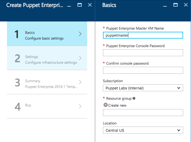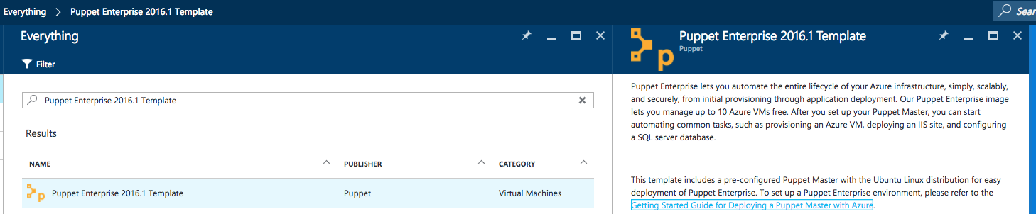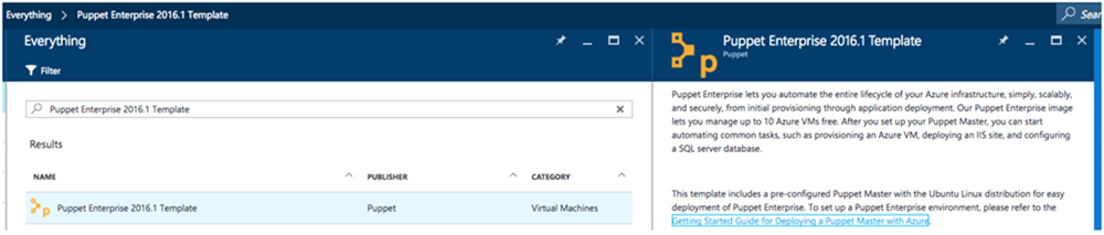 Simply search for Puppet Enterprise 2016.1 Template in the Azure Marketplace to get started, as shown below.