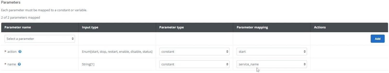 - In the Parameters table, for the name parameter, in the Parameter type list, click constant. To ensure the step targets the same service that was stopped, select the existing service_name option.