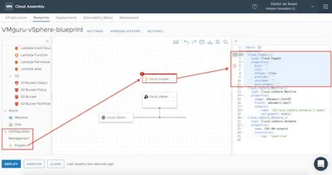 In this post, I will walk you through how to integrate Puppet Enterprise with VMware Cloud Assembly and use it in your blueprint so that you can manage deployments for configuration and drift. In this example I'll be using a vSphere blueprint which I created in a previous post and saved by creating a version.