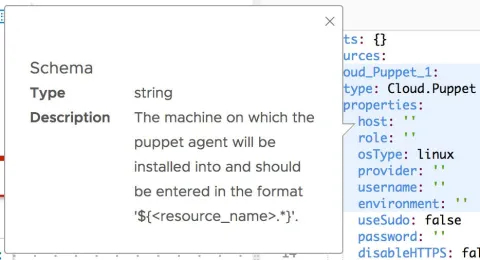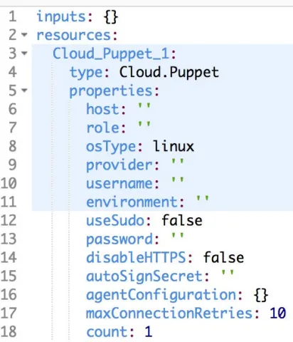 - In the YAML editor, click on + to view all available code properties for the Puppet component.