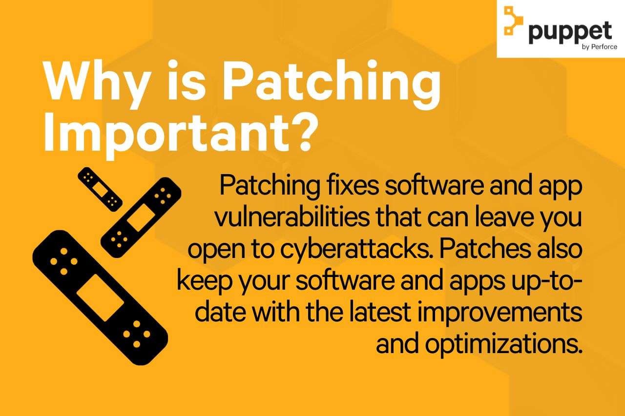 Patching is important because it fixes software and app vulnerabilities that can leave you open to cyberattacks. Patches also keep your software and apps up-to-date with the latest improvements and optimizations, leading to better performance, new capabilities, and less downtime.