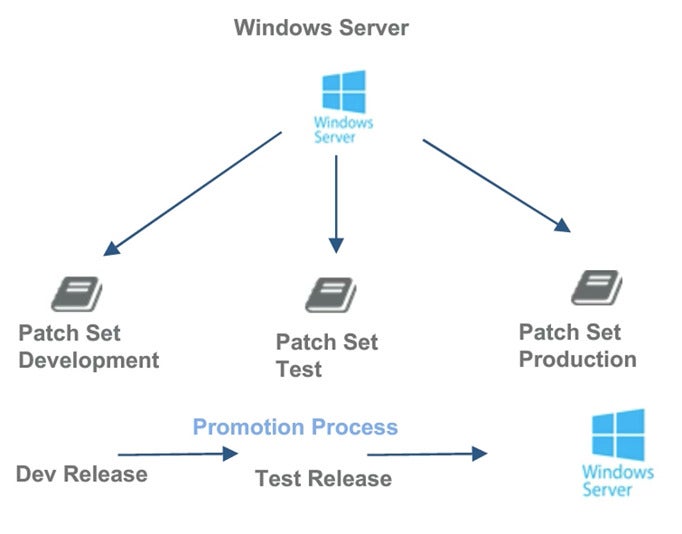 Puppet can easily manage Windows patching and hot fixes in a Windows environment. This diagram shows how you can use Puppet to move a patch from development to testing to production.
